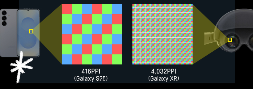 Galaxy XR 的左右眼前各搭载一块 OLEDoS 面板,显示规格达到 4K(3552×3840)分辨率,每英寸像素数(PPI)为 4032。该面板采用白色 OLEDoS(W-OLEDoS)技术,通过在硅基板上沉积白色发光层,再覆盖红色(R)、绿色(G)、蓝色(B)彩色滤光片来实现色彩显示。
