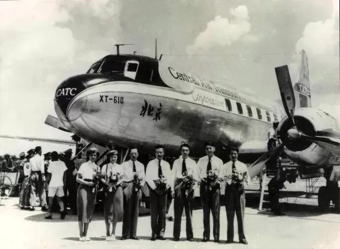 1950年8月1日,“八一开航”时,“北京”号机组在广州白云机场起飞前合影,左五为飞行员潘国定。
