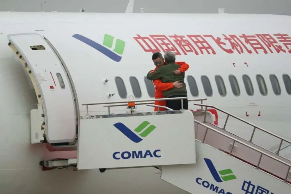 首飞后,C919总设计师吴光辉身着军绿色飞行夹克,登上舷梯,与首飞机长蔡俊紧紧拥抱。